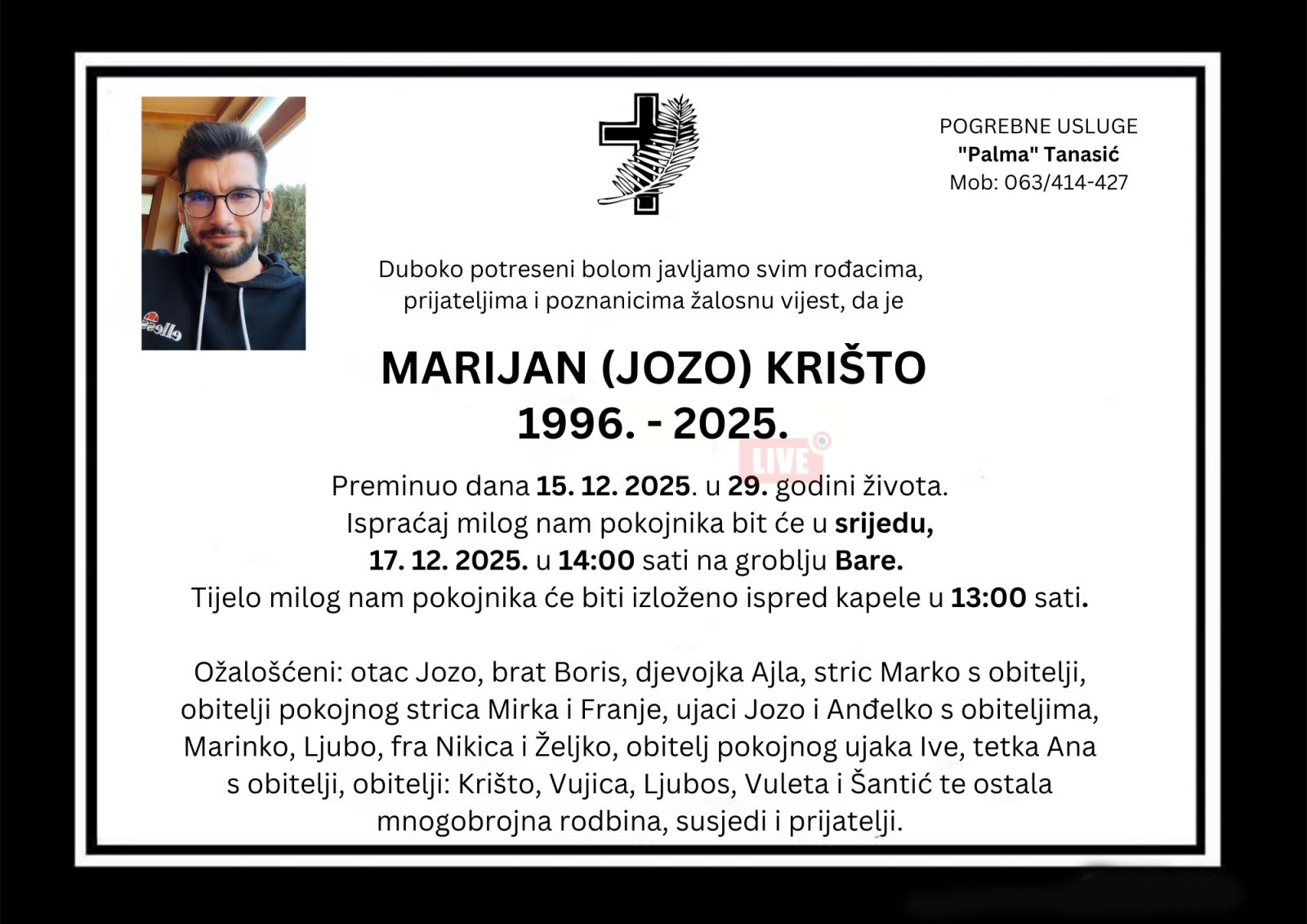 Redakcija portala JablanicaLive izražava iskreno saučešće porodici, prijateljima i kolegama Marijana Krište. U tišini i poštovanju, dijelimo tugu s onima koji su ga poznavali i voljeli. Neka mu je vječni mir.