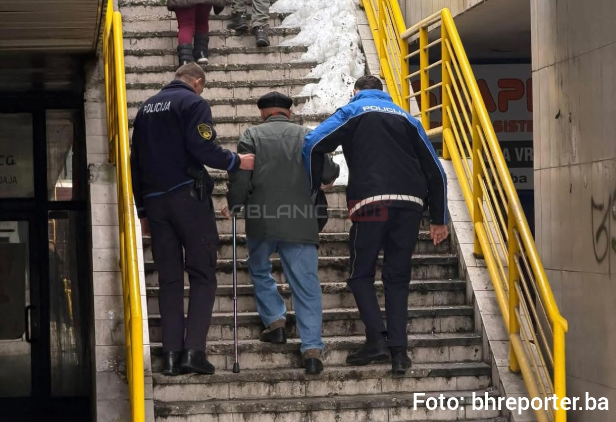 U tržnom centru Brčanska Malta, dvojica policijskih službenika MUP-a Tuzlanskog kantona primijetila su starijeg sugrađanina koji se, uz pomoć štapa, teško kretao stepenicama prekrivenim snijegom i vlagom.