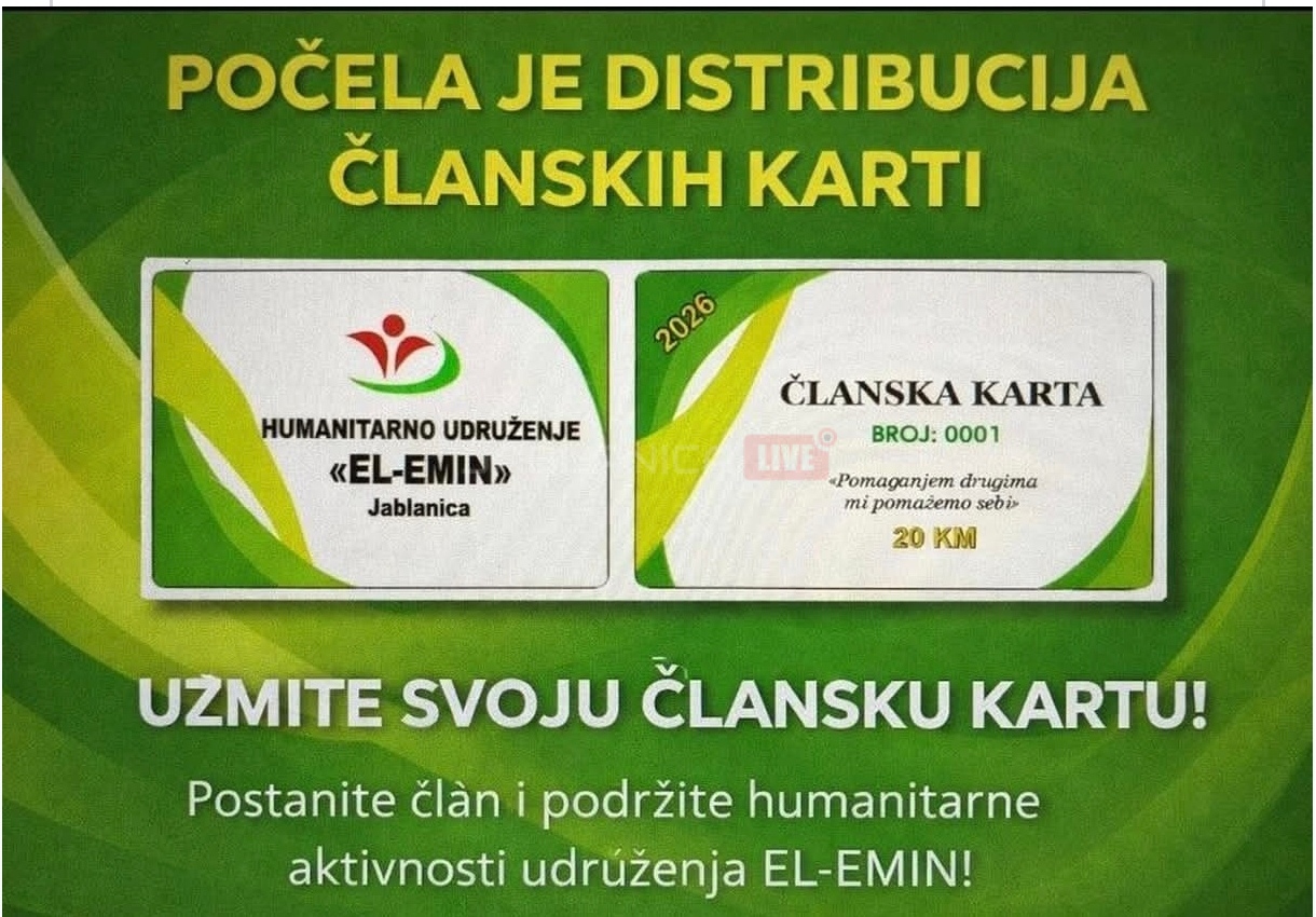 Humanitarno udruženje „El-Emin“ iz Jablanice objavilo je početak distribucije članskih kartica za 2026. godinu, pozivajući sve građane da podrže njihove aktivnosti i postanu dio zajednice koja pomaže najugroženijima.
