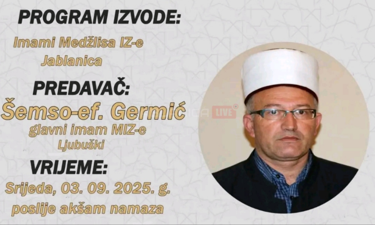 U okviru manifestacije “Volimo te naš Poslaniče”, Medžlis Islamske zajednice Jablanica organizuje svečani Centralni mevludski program koji će se održati u srijedu, 03. septembra 2025. godine, poslije akšam-namaza, u Čaršijskoj džamiji u Jablanici.