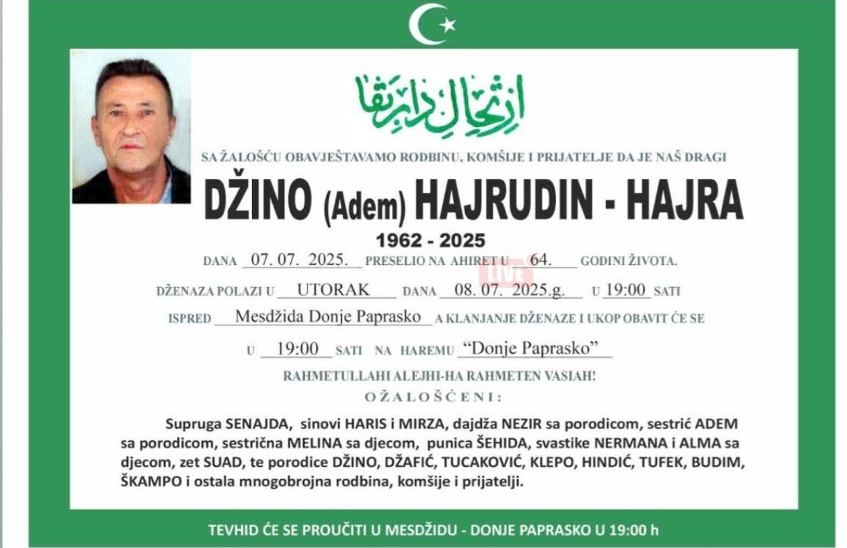 Dženaza će se klanjati u utorak, 8. jula 2025. godine u 19:00 sati ispred mesdžida u Donjem Paprasku, a ukop će se obaviti na mezarju “Donje Paprasko”. Tevhid će se proučiti u mesdžidu u isto vrijeme.