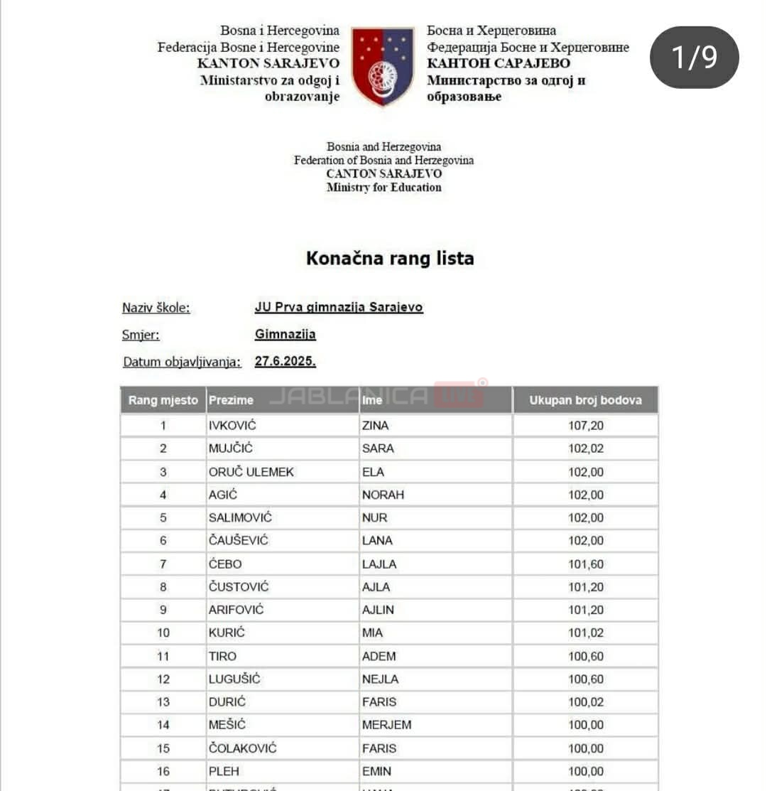 Podsjetimo, Prva gimnazija Sarajevo, osnovana davne 1879. godine, najstarija je sekularna srednja škola u Bosni i Hercegovini i jedna od najuglednijih obrazovnih institucija u zemlji. Njena tradicija i ugled čine je simbolom izvrsnosti, a upisati se među najbolje u toj školi znači stati rame uz rame s generacijama koje su obilježile kulturni i akademski život Sarajeva.