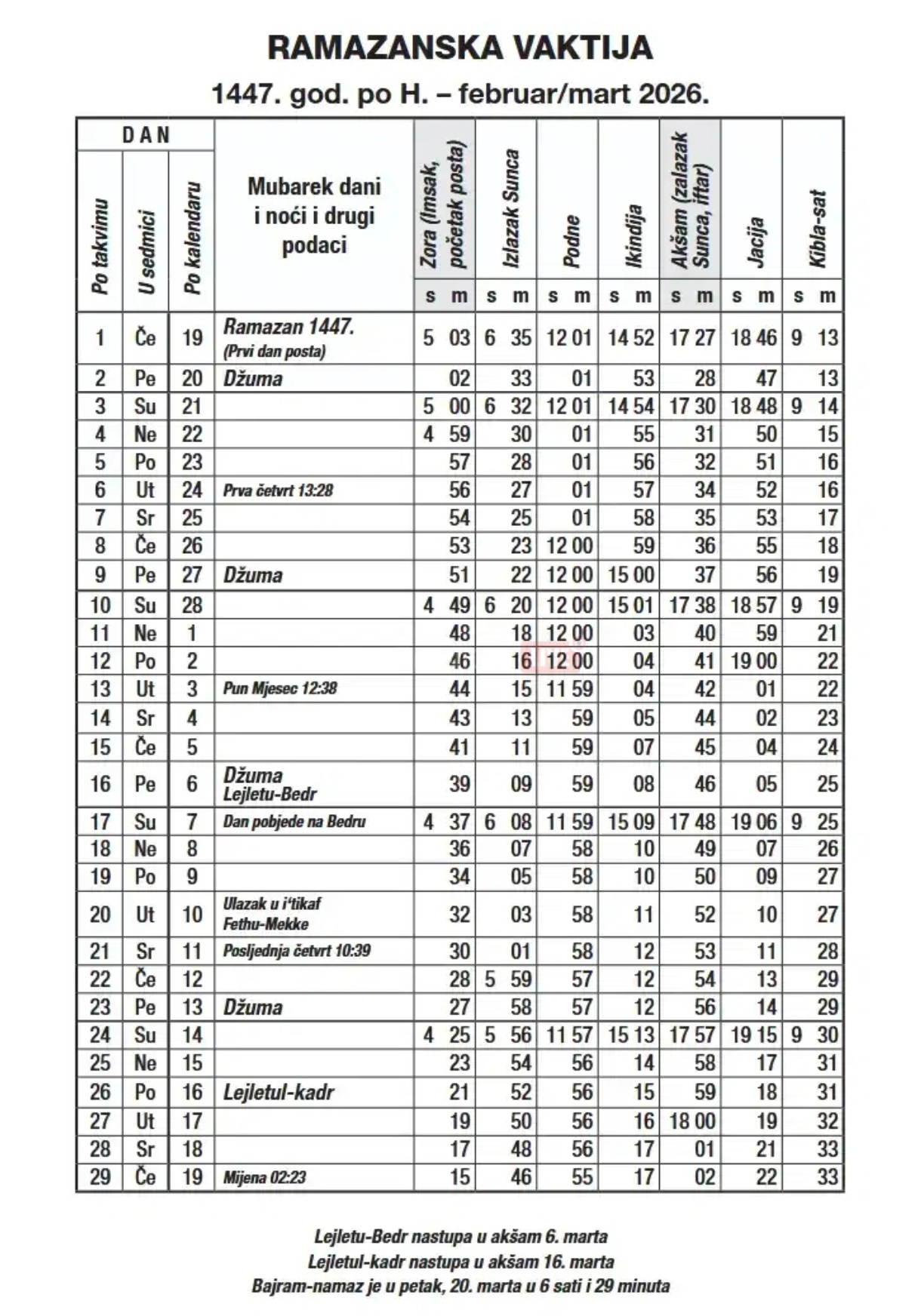Ramazan će trajati 29 dana, a tokom ovog perioda obilježit će se i dvije značajne noći – Lejletul-Bedr, u petak, 6. marta, te Lejletul-Kadr, koja prema vaktiji nastupa u noći sa 15. na 16. mart 2026. godine.