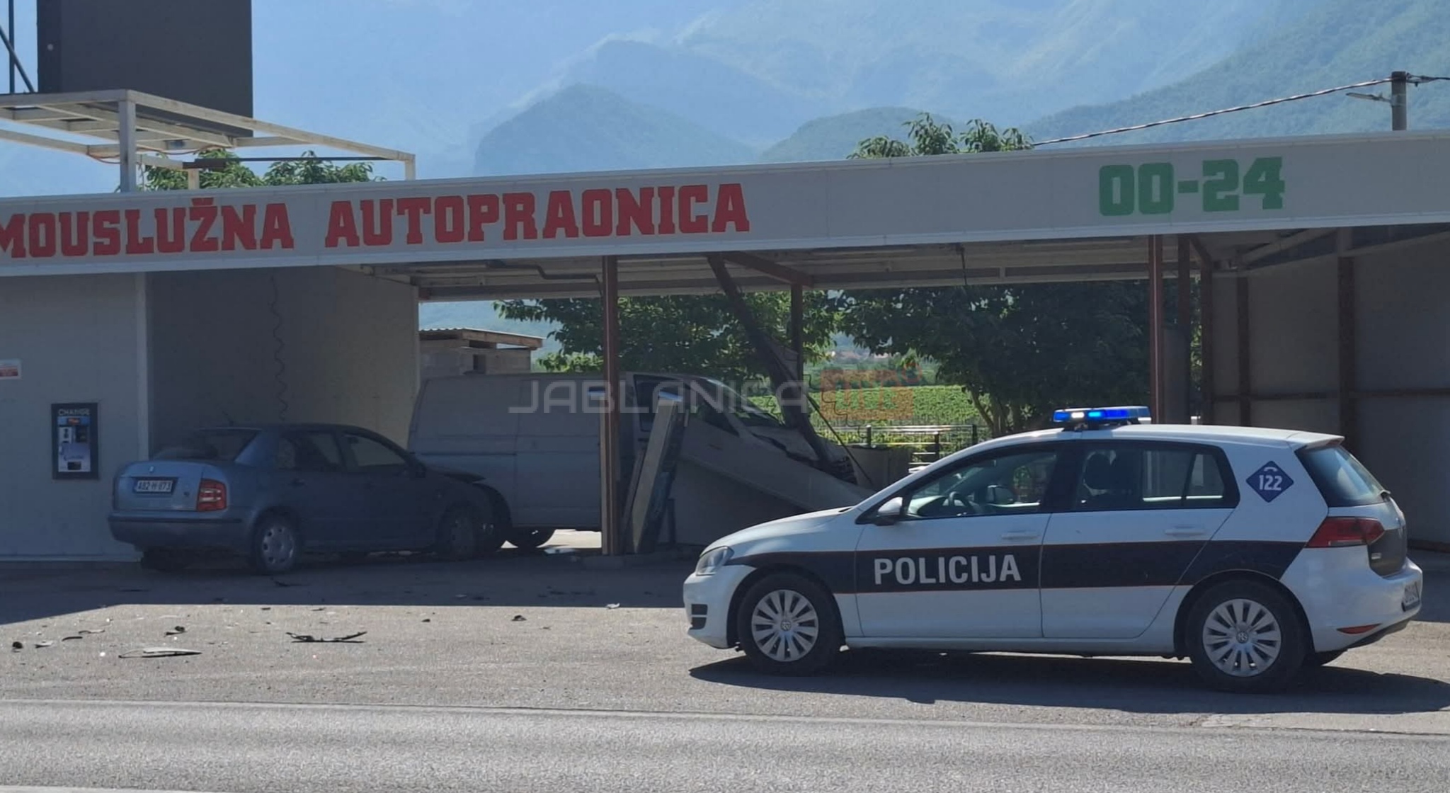 U naselju Vrapčići, sjeverno od Mostara, dogodila se neuobičajena saobraćajna nesreća kada je putnički kombi udario u konstrukciju samouslužne autopraonice smještene nasuprot benzinske pumpe Selex.