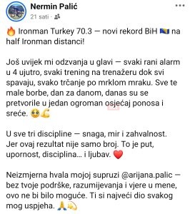Bosanskohercegovački triatlonac Nermin Palić ostvario je historijski uspjeh na prestižnom triatlonu IRONMAN 70.3 Türkiye, održanom u turskom gradu Beleku. U konkurenciji više od 1.200 takmičara iz cijelog svijeta, Palić je završio utrku za 4 sata, 25 minuta i 47 sekundi, čime je postavio novi bh. rekord na half Ironman distanci, piše Bljesak.info.