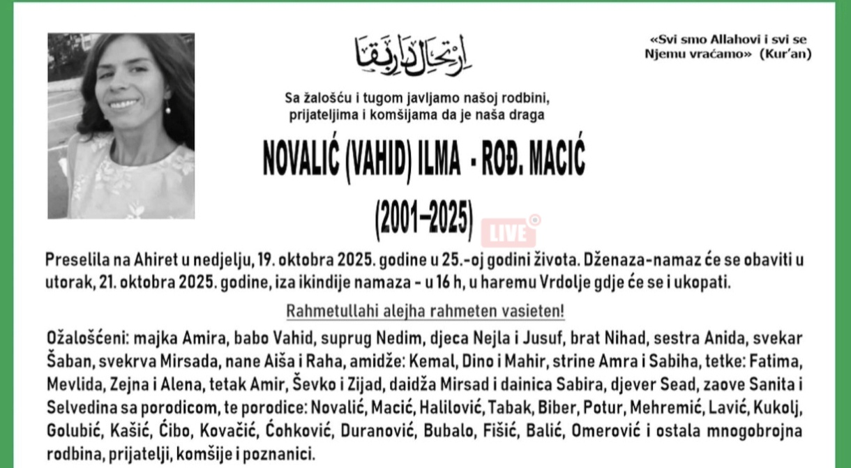S tugom i nevjericom, Konjic i šira zajednica oproštaju se od Ilme Novalić (rođ. Macić), koja je preselila na Ahiret u nedjelju, 19. oktobra 2025. godine, u 25. godini života.