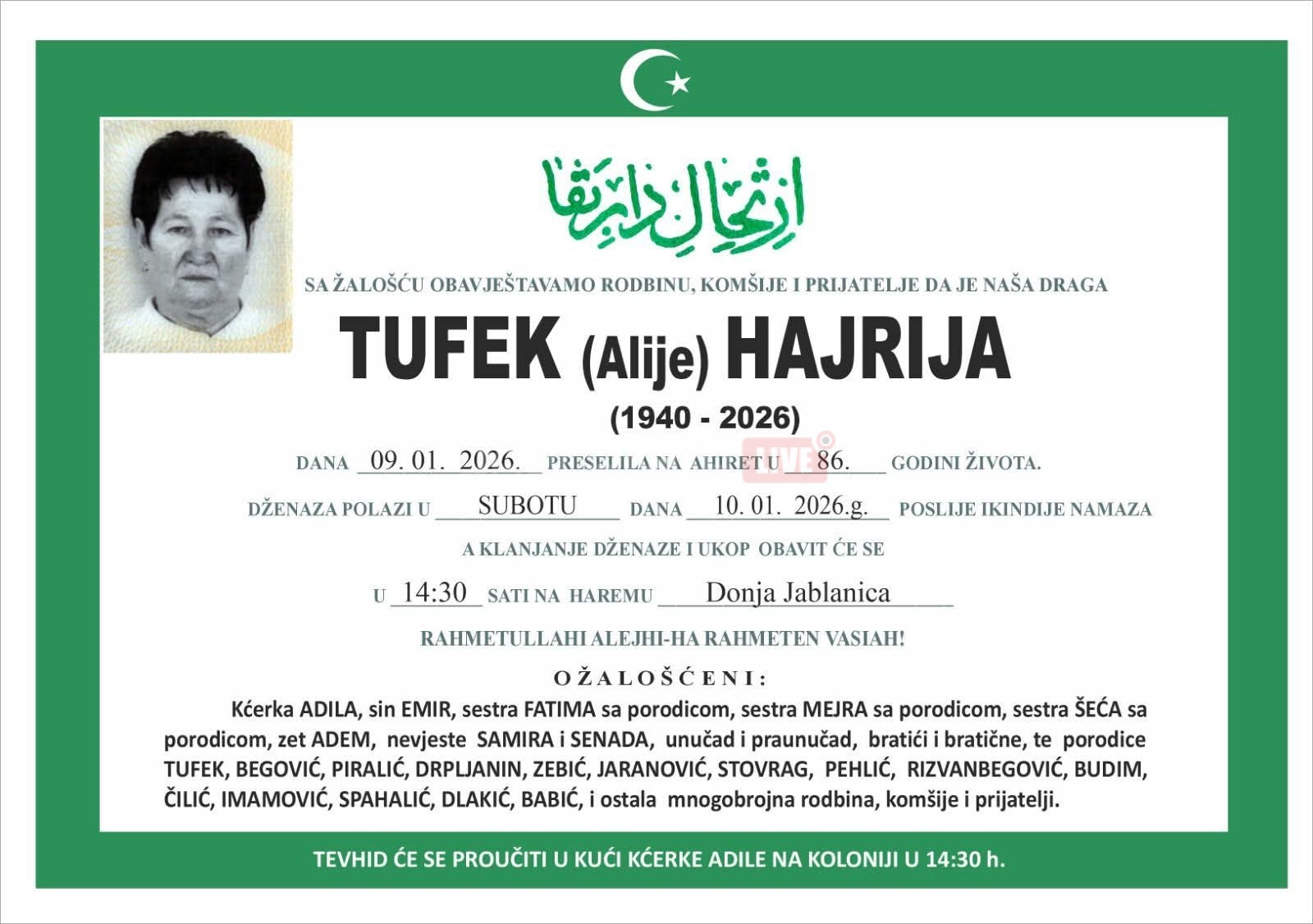 Dženaza Hajriji Tufek biće klanjana 10. januara 2026. godine, poslije ikindije namaza, na haremu u Donjoj Jablanici. Tevhid će se proučiti u kući kćerke Adile na Koloniji.