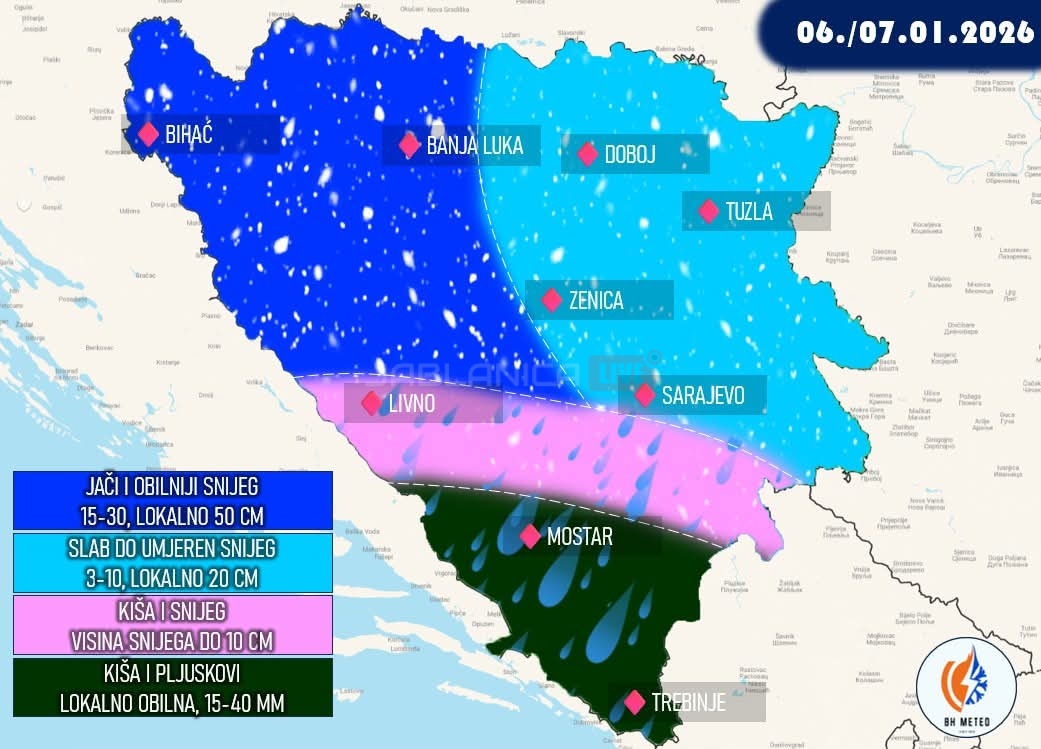 Bhmeteo navodi da će snijega biti i tokom srijede, ali bez značajnijeg intenziteta. U večernjim satima, uz prodor hladnijeg zraka, snježne padavine moguće su i u južnijim dijelovima Hercegovine.