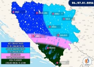 Prema prognozi Bhmeteo servisa, Bosnu i Hercegovinu od sutra, 6. januara, od sredine dana pa do srijede ujutro, očekuju nove — mjestimično obilnije — snježne padavine.