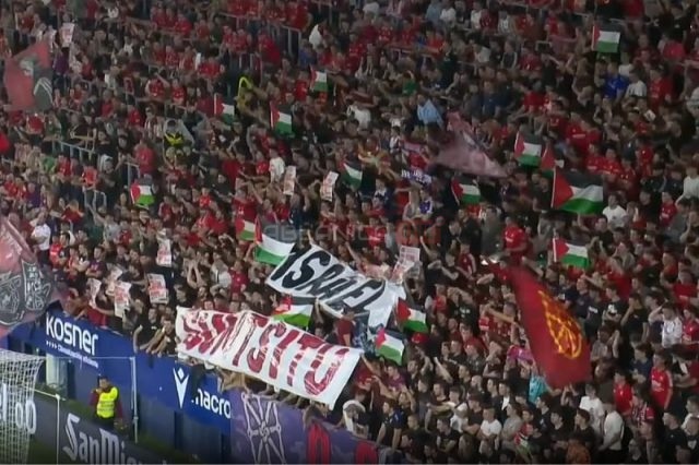 “Israel, Suntsitu”, pisalo je na transparentima navijača Osasune, koji su okolo istakli i brojne palestinske zastave, podržavši narod koji trpi teror izraelske vojske.
