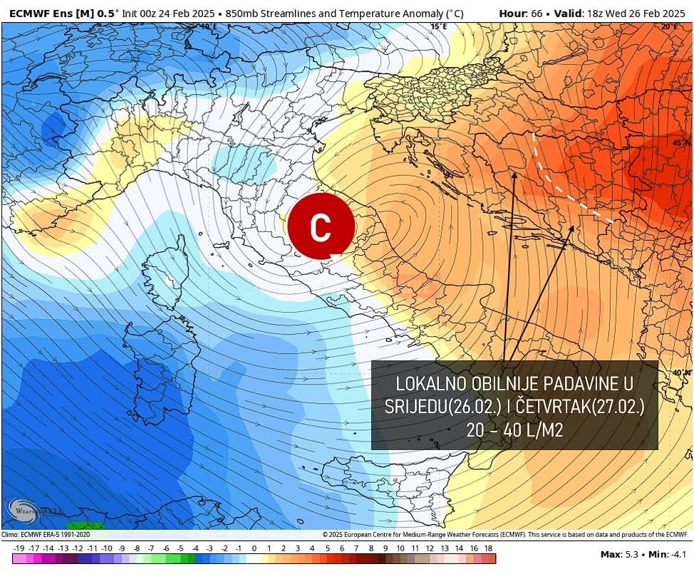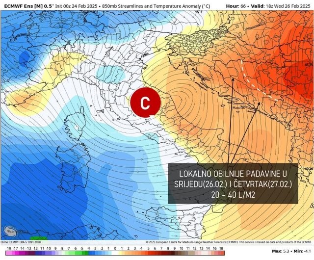 U srijedu i četvrtak više padavina u dijelovima Hercegovine, jugozapadne, zapadne i sjeverozapadne Bosne, gdje lokalno može pasti 20-40 litara po metru kvadratnom. U ostatku zemlje padavine samo u manjim količinama.