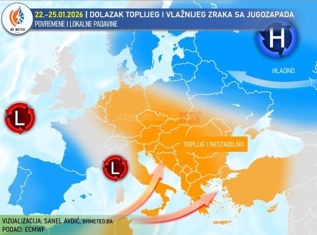 Od četvrtka(22.01.) pa do nedjelje(25.01.) kreće uticaj južine i priliv toplijeg i vlažnijeg zraka sa jugozapada. Preovladavat većinom pretežno oblačno i nestabilno vrijeme uz lokalno kišu. Više padavina u Hercegovini, na jugozapadu i zapadu Bosne. Na sjeveru, sjeveroistoku i istoku Bosne uz povremeno sunčane periode.