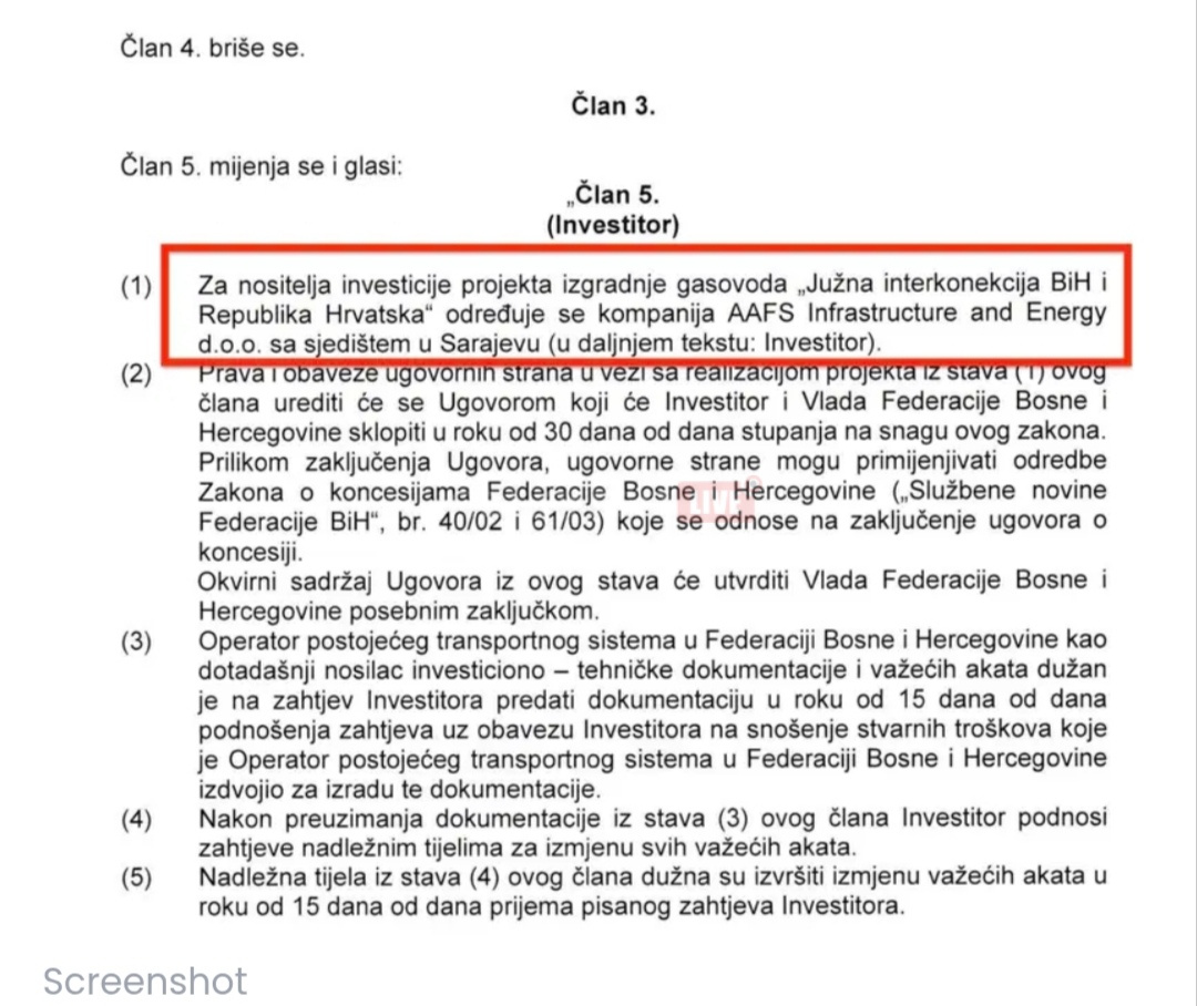 Prema članu 5., kako je iz Vlade FBiH i najavljeno, nosilac projekta investicije je američka kompanija AAFS Infrastructure and Energy. Ona je u međuvremenu registrovana i u Sarajevu.