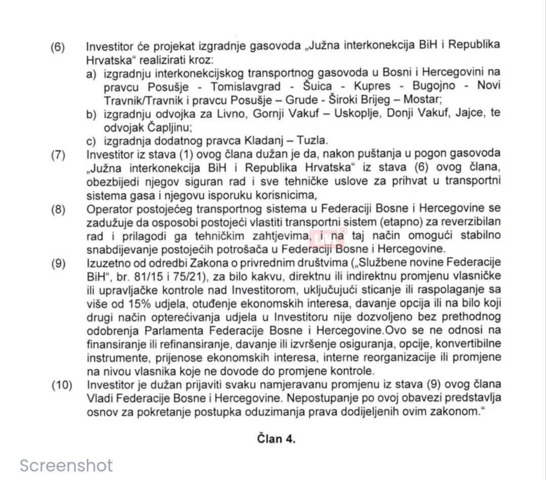 BH Gas, kao operator postojećeg transportnog sistema u FBiH, dakle, izbacuje se iz zakona. Iz Vlade navode da je BH Gas, kao dotadašnji nosilac investiciono – tehničke dokumentacije i važećih akata na zahtjev investitora zadužen da preda tu dokumentaciju u roku od 15 dana od dana podnošenja zahtjeva.