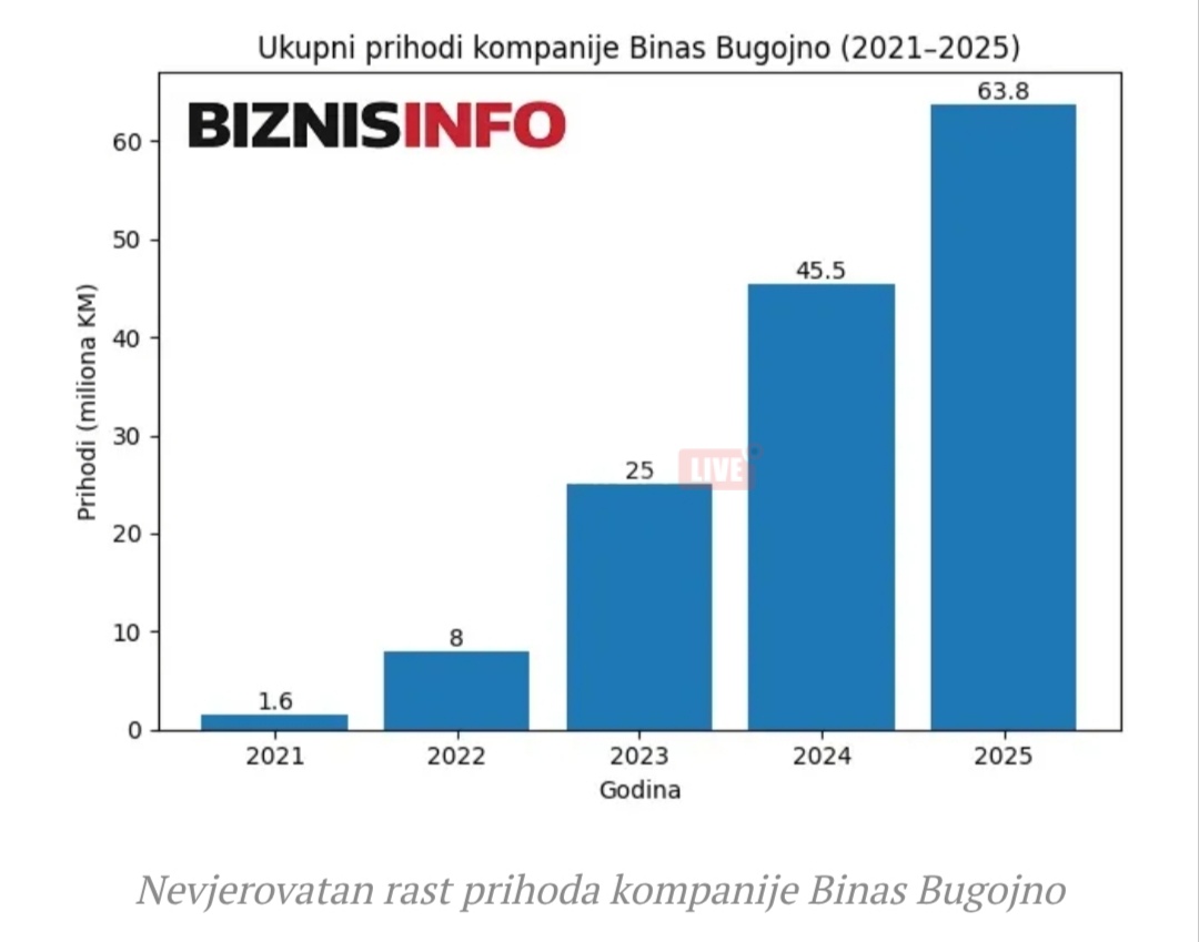 Grafika koju donosimo pokazuje nevjerovatan uspon Binasa, koji je nekada bio kompanija na izdisaju, a danas je jedan od lidera domaće namjenske industrije i vjerovatno najbolji primjer transformacije koju je ovaj sektor doživio posljednjih godina.