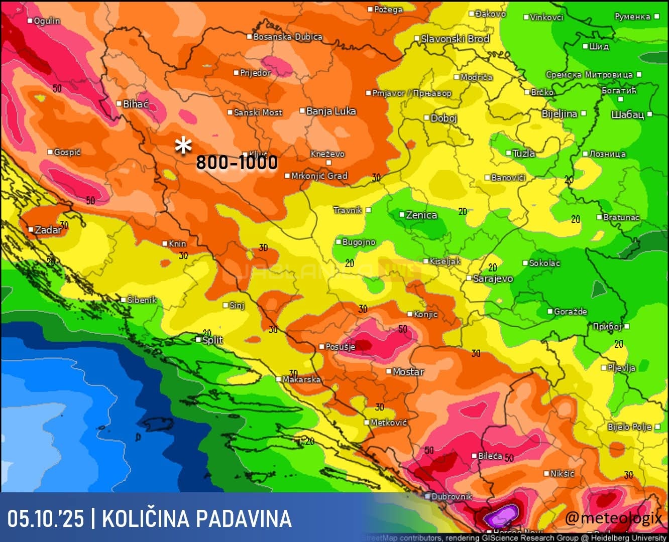 U nedjelju, 5. oktobra, Bosnu i Hercegovinu zahvata novo pogoršanje vremena koje će biti izraženije nego prethodnih dana. Padavine će zahvatiti veći dio zemlje, a glavnina se očekuje tokom poslijepodneva. Većina krajeva može dobiti između 15 i 35 mm kiše, dok su lokalno moguće količine i do 50 mm prenosi BHMETEO.ba