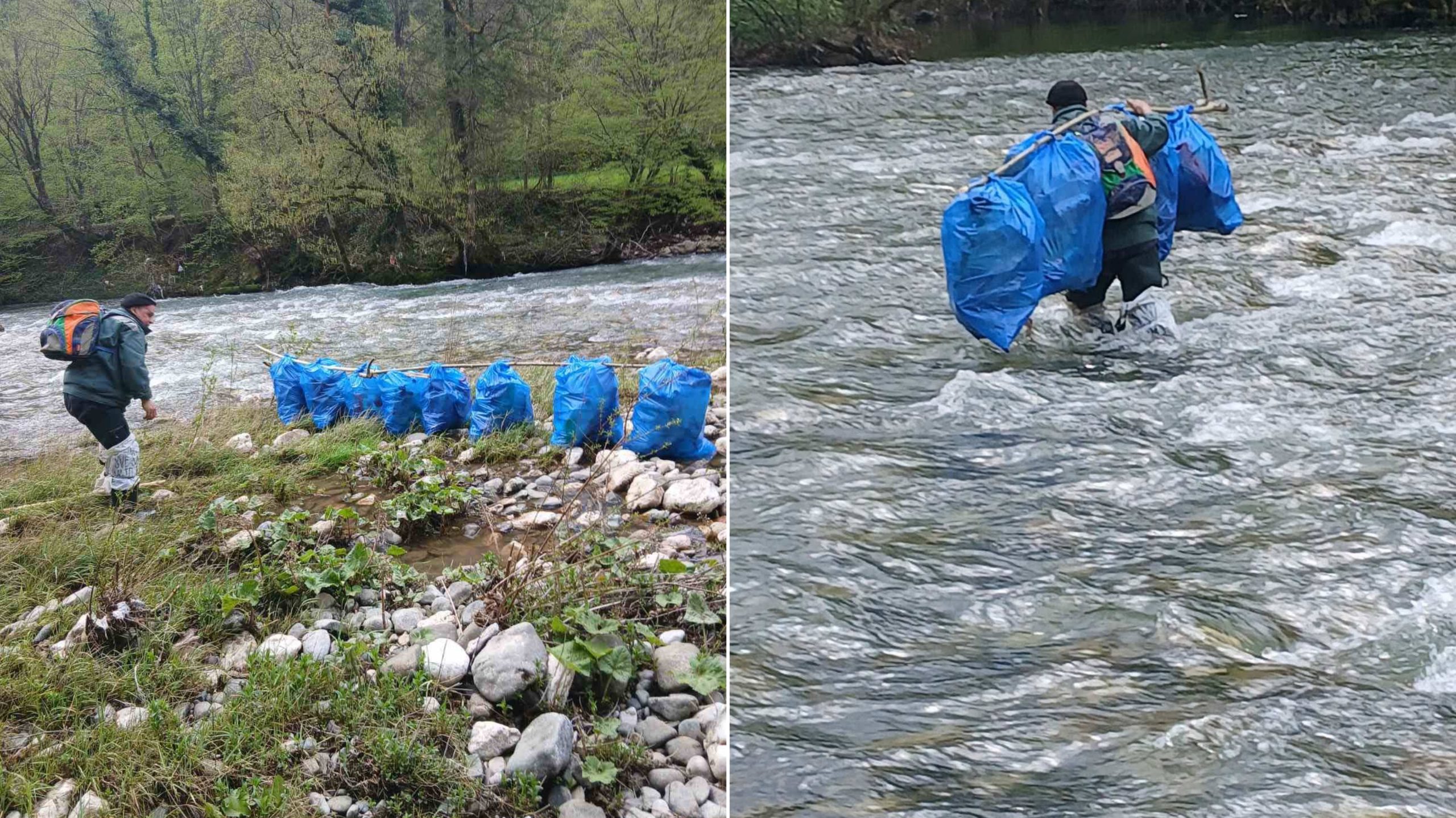 Fotografije s terena pokazuju koliko je posao bio zahtjevan, jer su volonteri prolazili kroz teško pristupačne dijelove rijeke, gazili kroz vodu i nosili pune vreće otpada.